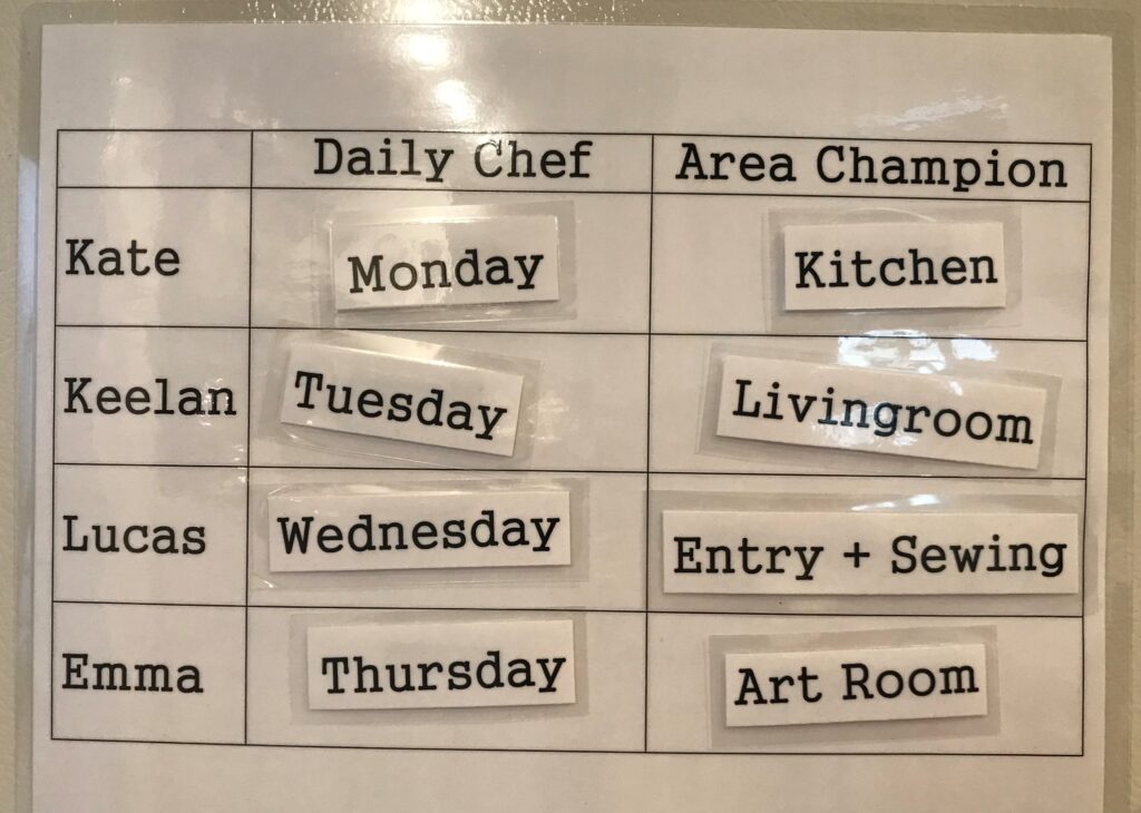 Everyone is still individually expected to clear their dishes from the table and whatnot. The Daily Chef is responsible for clearing anything else, wiping the table, putting out snacks, and helping with dishes (although I’m not going to lie this part still isn’t a perfect system for us).
